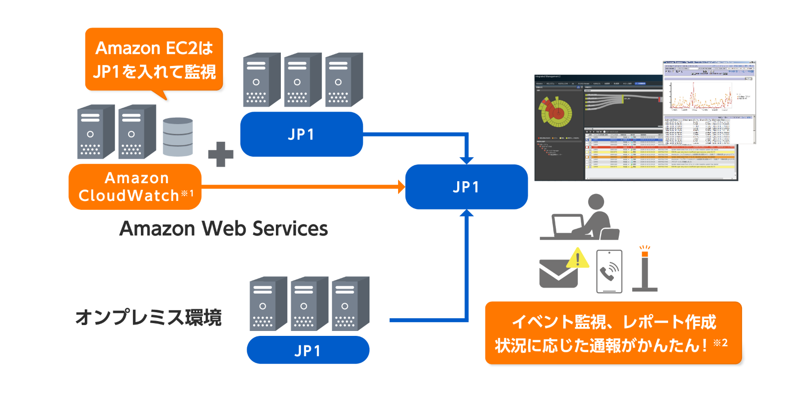 ※2 JP1の監視製品と連携することにより、レポート作成なども可能になります。
