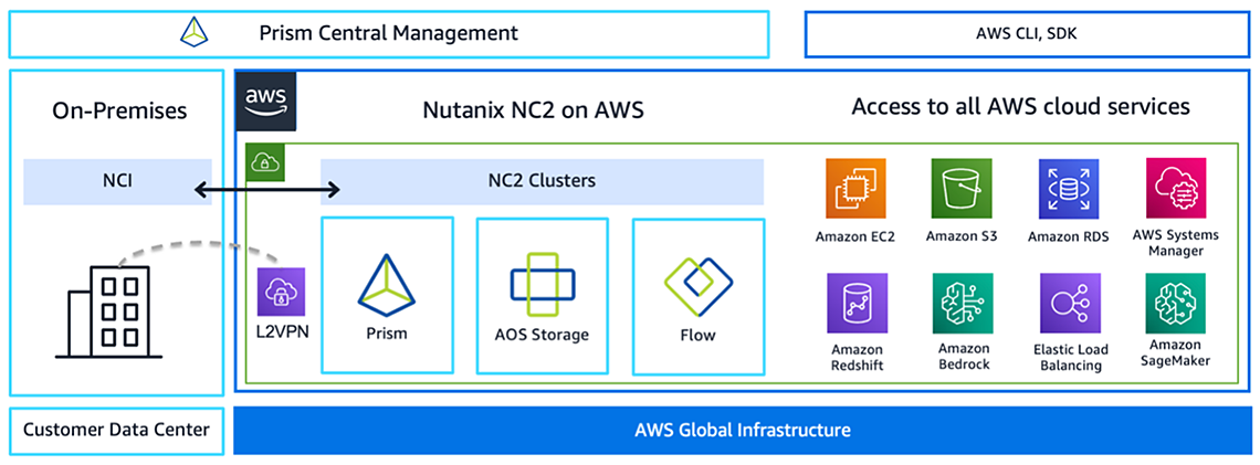 NC2 on AWS は、企業にオンプレミスの Nutanix 環境と AWS の拡張性およびサービスを橋渡しする、シームレスなハイブリッドクラウド体験を提供します。