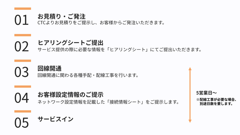 ヒアリングシートご提出後、設計・開通作業を経て、最短5営業日でクラウド接続を開始できます。