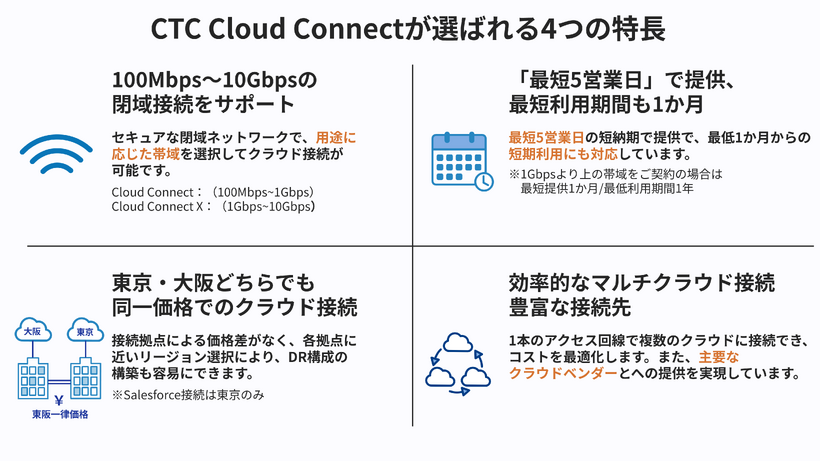 100Mbps~10Gbps の閉域接続に対応し、用途に応じた帯域選択が可能なクラウド接続サービスです。最短5営業日で利用開始でき、東京・大阪いずれも同一価格で提供します。1回線で複数クラウドに接続でき、構成の簡素化とコスト最適化を実現します。