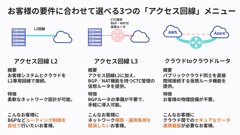 ネットワーク設計の自由度や運用負荷に応じて、3つのアクセス回線メニューを選択できます。自社で柔軟にネットワーク設計を行う アクセス回線L2、BGPやNATをサービス設備側に設定、利用できるアクセス回線L3、設備不要でクラウド間を接続する クラウドtoクラウドルータ をご用意しています。