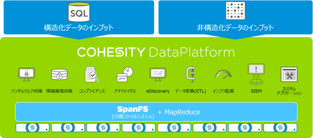 Cohesityは、サイロ化されたデータの統合管理を実現するハイパーコンバージド型セカンダリストレージです。単一のデータプラットフォームを形成し、データ可視化、分析、セキュリティ強化等、データ利活用に必要な多種の機能を提供します。