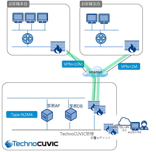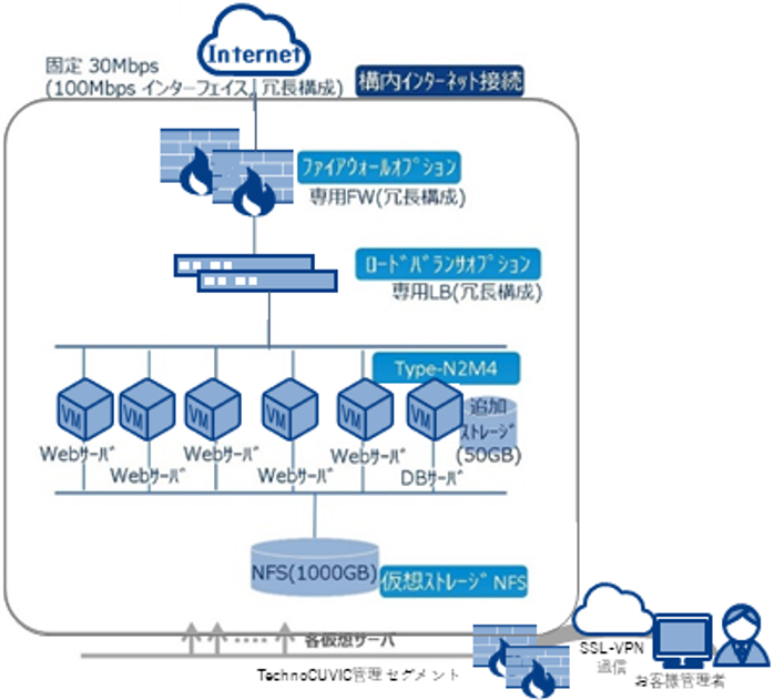 30M固定インターネットコネクティビティとTechnoCUVICのFW、LBオプション(専用)を利用した構成です。
