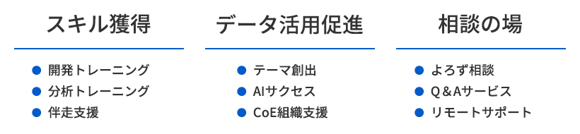 データ活用基盤やBI/AI開発ツールの活用最大化を目指し、スキル強化から、実践的な活用支援、日々の相談対応まで、IT部門・DX推進部門の課題解決を包括的にサポートします。