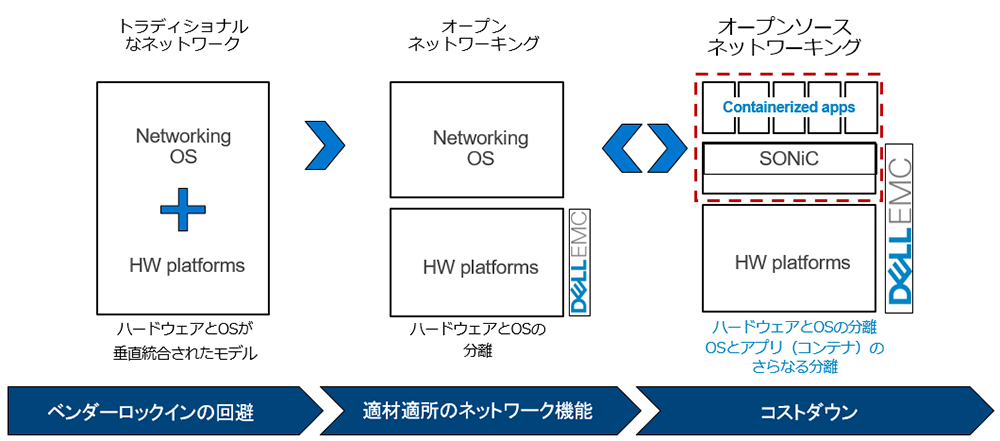 Dell EMCの新しいデータ センター ネットワーキング モデルのビジョンは、組織が革新的な業界標準のネットワーク アプリケーション、ネットワーク オペレーティング システム、およびネットワーク ハードウェアから自由に選択できるオープンなエコシステムです。