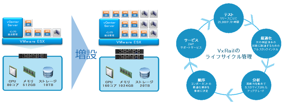 VxRailアプライアンスはサーバとストレージをそれぞれ用意する場合に比べ設置スペースや消費電力を大幅に削減できます。導入時においては、あらかじめセットアップされたVxRailアプライアンスが届くため、動作確認済みの構成を短期間で構築可能です。拡張の際にはノードの追加によるスケールアウト、メモリやドライブを追加するスケールアップの両方に対応できます。また、互換性および事前動作確認済みのアップデートパッケージが1パッケージで提供されており、vSphereライセンスを問わずサービスを停止することなくアップデートを行うローリングアップデートを実行できます。