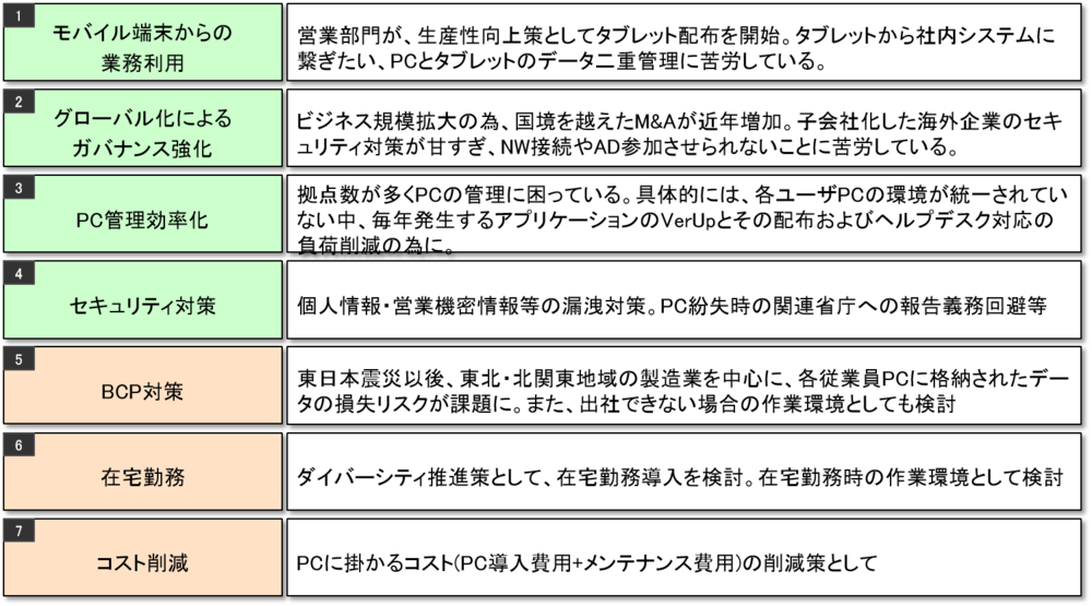 2020年05月26日更新 CTCが提供するデスクトップ仮想化ソリューションに関する情報をこちらに集約しました。 CTC(伊藤忠テクノソリューションズ) ワークスタイル/健康管理 仮想化 デスクトップ仮想化とは CTCの取り組み 導入支援サービス 導入事例 主な取り扱い製品 まず、CTCが考えるデスクトップ仮想化の定義について概説します。 デスクトップ仮想化の定義 ユーザのデスクトップ環境(OS、アプリ、データなどのユーザ環境)を、「どこでも」 「安全に」利用するために、データセンター等のセキュリティの高い場所に置くこと よくある誤解 初期投資は安くなりません!集中管理などにより、運用コストをいかに抑えるかが重要となります。さらに、セキュリティ/情報漏洩リスク、利便性/生産性向上など、コスト以外の定性的な効果も盛り込んで検討を行う必要があります。 解決される課題(期待効果) 過去事例より、仮想デスクトップを検討される主な理由は下記の7点です。貴社に同様の課題があるか、ご確認ください。