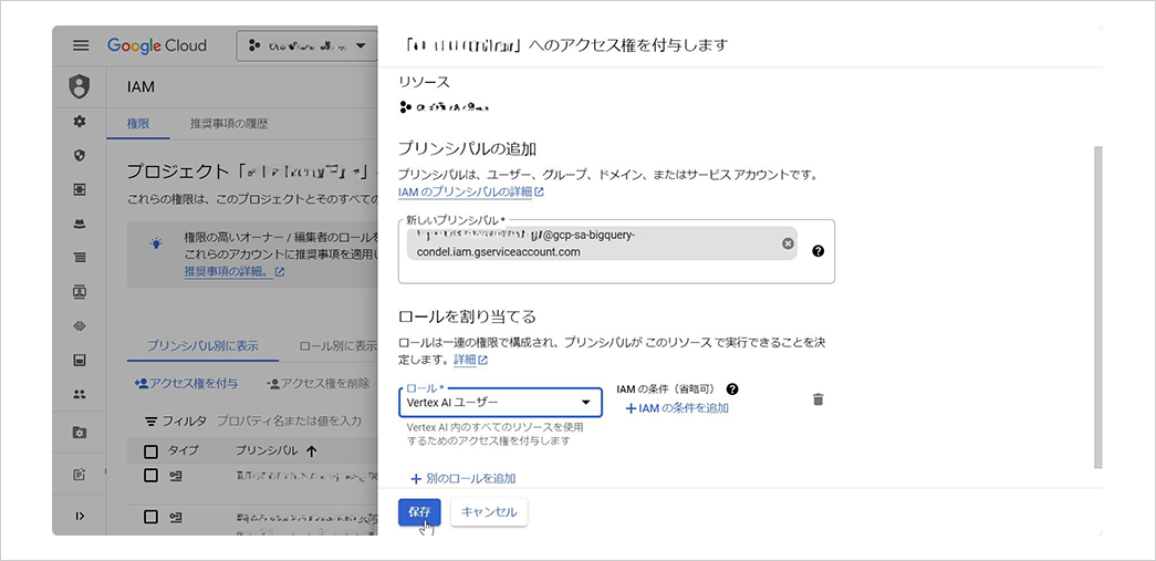 アクセス権を付与を選択し、新しいプリンシパルにコピーしたサービスアカウントIDを貼り付け、ロールにVertex AIユーザーを選択します。