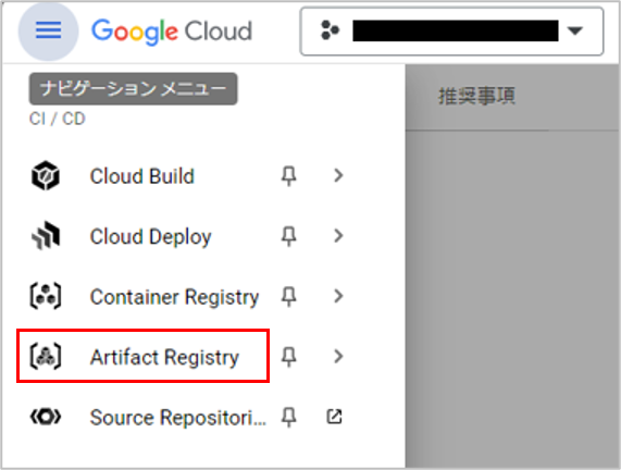1. Google Cloud コンソールにて画面左上の「≡」をクリックし、「Artifact Registry」をクリックします。