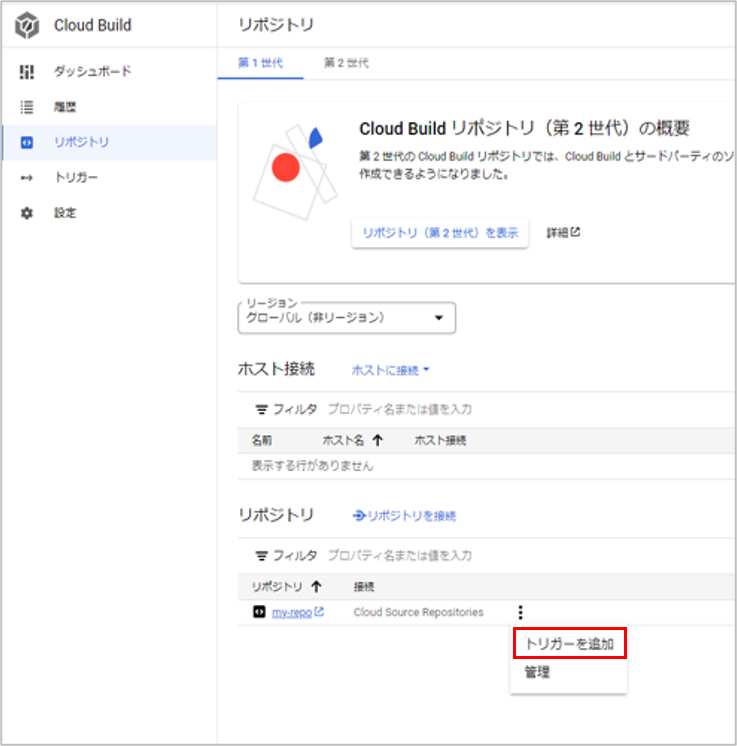 2. 「リポジトリ」画面に「②Cloud Source Repositoriesの作成、ソースコードのPush」の手順で作成したリポジトリが表示されていることを確認し、「︙」をクリックして「トリガーを追加」をクリックします。