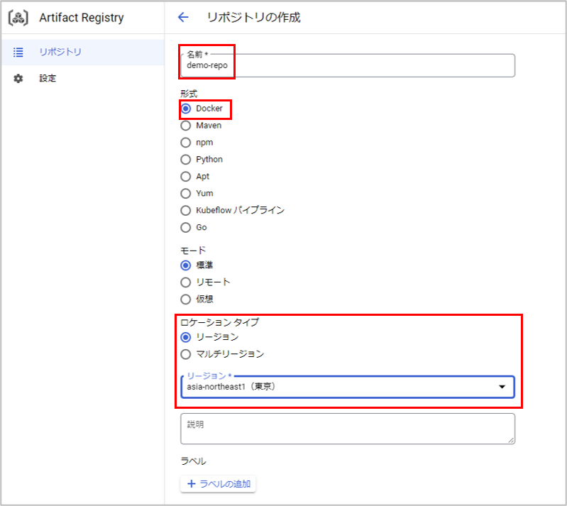 3. 名前を入力し、形式は「Docker」を選択します。リージョンは「asia-northeast1(東京)」を選択し、その他はデフォルト値のままで「作成」をクリックします。