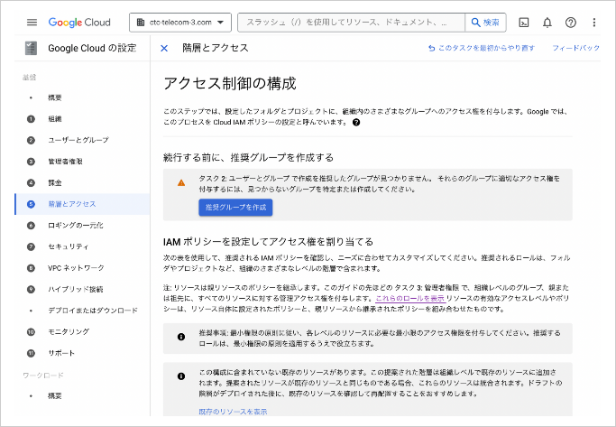 一方、ある程度決まっている場合は、組織/フォルダ/プロジェクトの階層構造を一度に構成できる階層とアクセスのメニューに移ります。リソース階層の”開始”を選択します。
