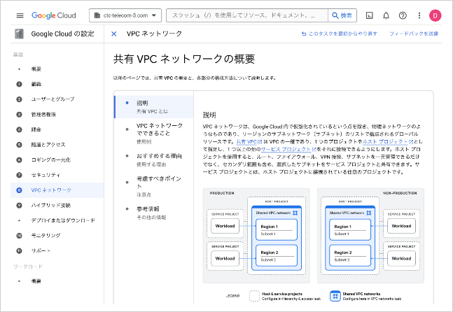 プロジェクト毎にVPCをそれぞれ構成する事が可能ですが、Google Cloudでは組織内のプロジェクト間で共有できるVPCまたは専用線接続先を構成する事ができます。