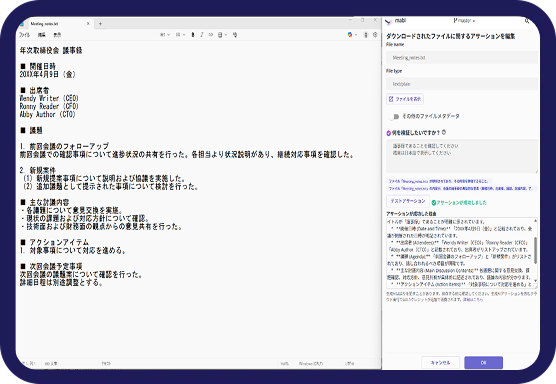 生成AIアサーションにより、ファイル名やファイル形式、ファイルサイズなどのメタデータ検証だけでなく、ダウンロードされたファイルの内容や、ダウンロード元ページのスクリーンショットと比較した検証も行えます。(早期アクセス)