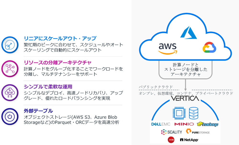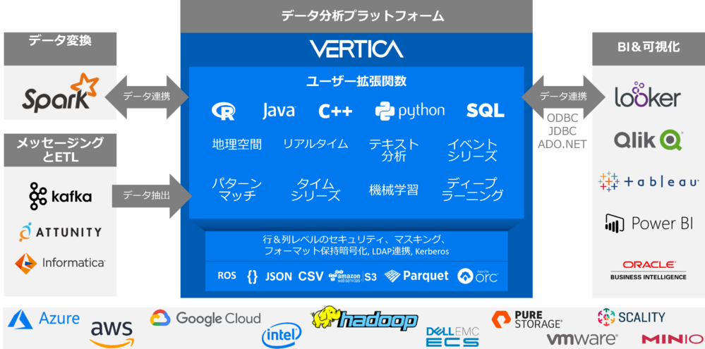 Vertica は、今日のデータドリブン(データ民主化)規模と複雑さへ対応できるよう設計された分析用データウェアハウスです。加え、機械学習機能・クエリエンジン機能を標準搭載された、今もっとも必要とされる統合分析ウェアハウスです。