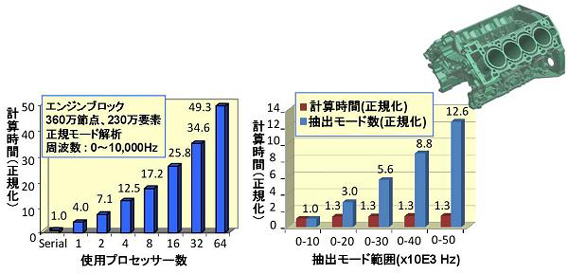 DMP(分散メモリ並列)とRecursive Domain Lanczos(自動部分構造合成法に基づくSimens独自の手法)の採用により、計算速度の向上及びより大規模な有限要素モデル解析を実現しました。 例えば、抽出モード範囲を0~1万Hzから0~5万Hzに変更すると、抽出モード数は12.57倍になりますが、計算時間は1.34倍ですので、抽出モード数が増えても計算時間に大きな影響を与えません。 この手法を用いることにより大規模モデル、高次モード抽出時に圧倒的な効果を発揮します。