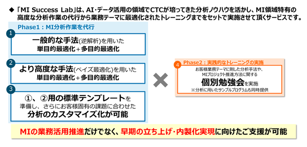 MI Success Labでは「MI分析の代行」×「MI分析プロセスのスキルトランスファー」の2つのコンテンツを合わせてお客様にご提供いたします。