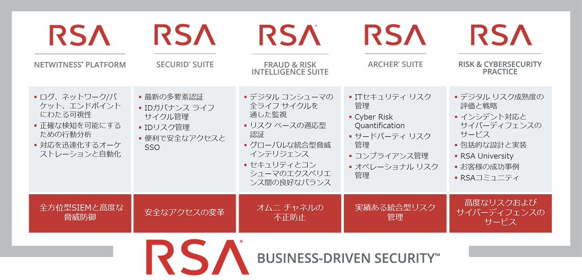 サイバーセキュリティおよびリスク管理ソリューションのリーダーであるRSAは、デジタル時代のセキュリティ対策、リスク管理、オンライン不正防止がもたらす課題に対処するためのテクノロジーを組織に提供します。 RSAソリューションは、高度な攻撃を効果的に検出して対応するように設計されており、ユーザーのアクセス管理、オペレーショナルリスク、オンライン詐欺、サイバー犯罪の低減を支援します。 RSAは世界中の数百万人のユーザーを保護し、フォーチュン500の90%以上の企業の成長に役立てられており、変革の変化に継続的に適応できるように支援しています。