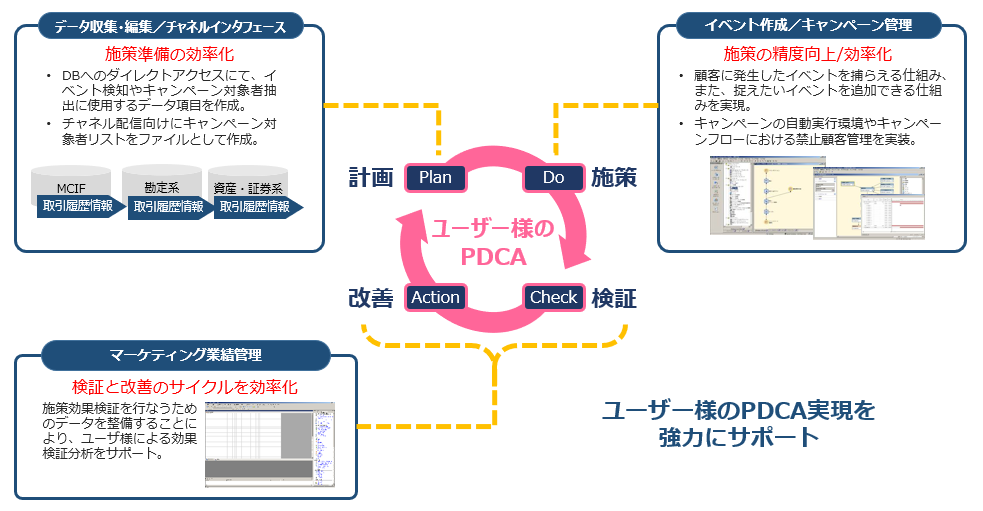 メールやDM、ATM、営業店窓口、コンタクトセンターなど、顧客がアクセスするチャネルを通して、「購入しそうな顧客」に、「購入したい商品」を「購入しそうなタイミング」で、適切なオファーを実現する。