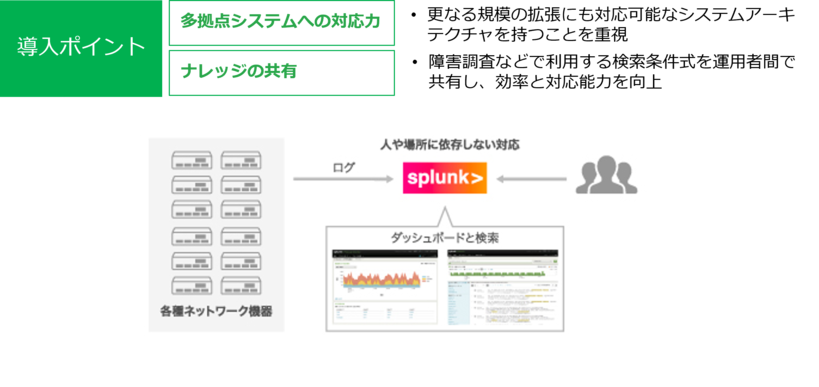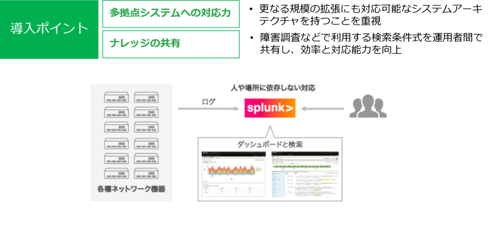 ネットワーク機器のログを収集、接続状態の確認や調査基盤を整備 調査ナレッジは共有し、緊急調査も担当者のスキルによらず対応可能に