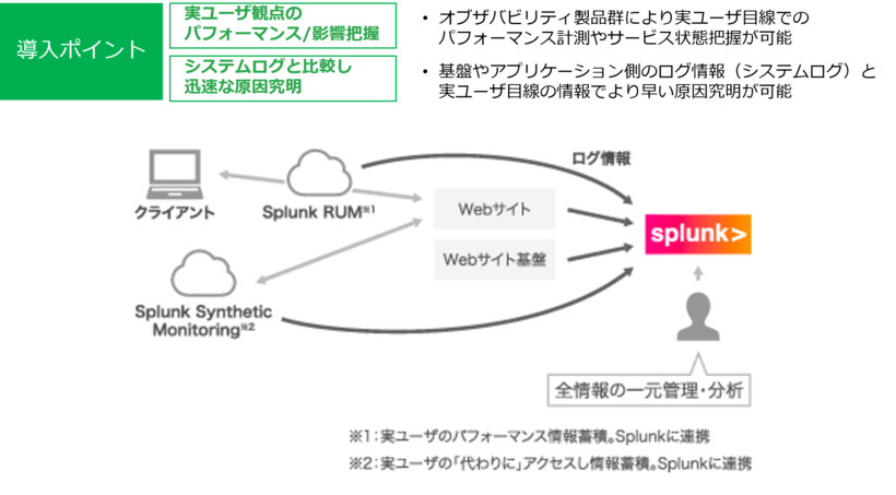 大事なWebサイトのパフォーマンス計測や監視を実施、Splunkで収集したシステムログと突き合わせて高度なサービス監視