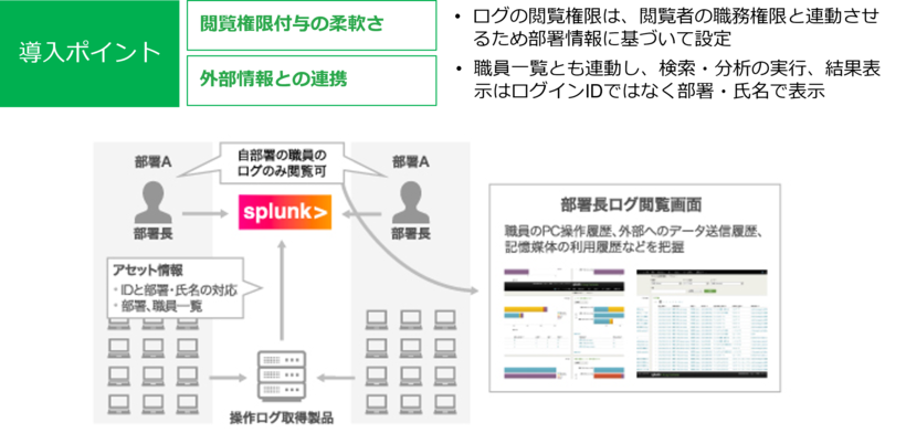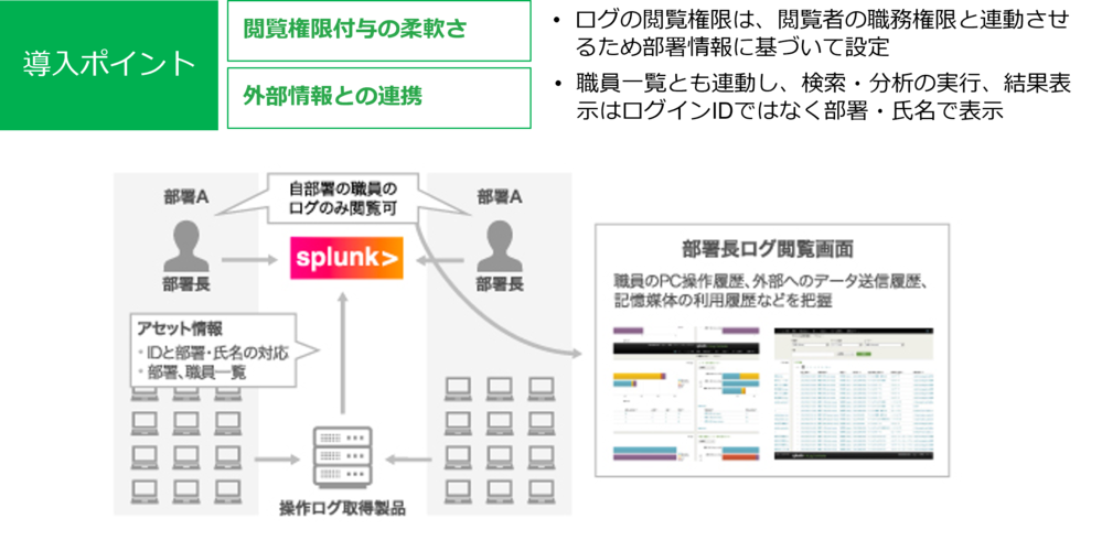 日常業務の統制強化、不正アクセスの抑止/発見を目的としてPC操作ログを収集し、職務権限に応じて管理者がモニタリングを実施
