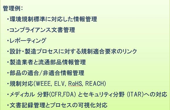 環境規制標準に対応した情報を管理し、製品の記録管理・保管からドキュメントや記録の維持管理までコンプライアンスの達成義務を支援します。