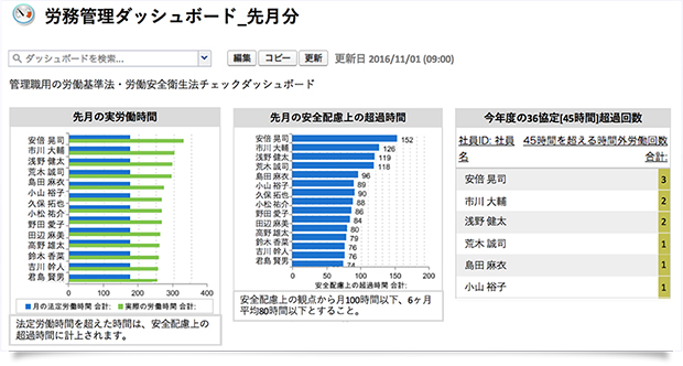 働き方変革だけでなく、もちろん、労務管理を適切行うこともできます。柔軟性の高いレポート機能、ダッシュボード機能により、残業時間や36協定上の超過状況などを一目でご確認いただくことが可能です。
