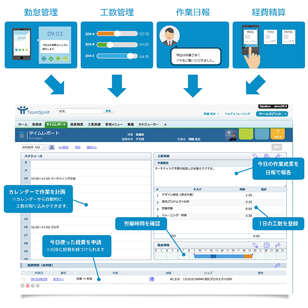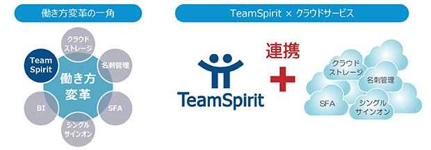 TeamSpiritは、勤怠管理、経費精算、就業管理、工数管理、電子稟議、SNSの機能を統合し、連携できるようにしたクラウドサービスです。多様な働き方をサポートし、従業員の方のパフォーマンスを最大化するための働き方変革を実現します。