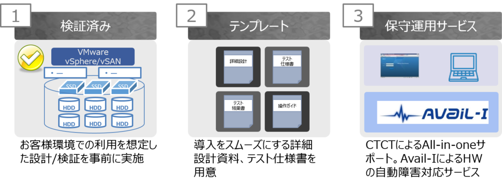 vCuveは、お客様に迅速かつ安定的な仮想化基盤をお届けするため次の3つをご提供しています。