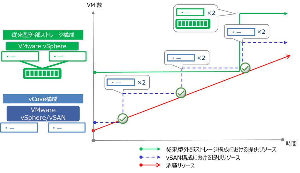 従来型外部ストレージ構成とvCuveの拡張性に関する投資の違い