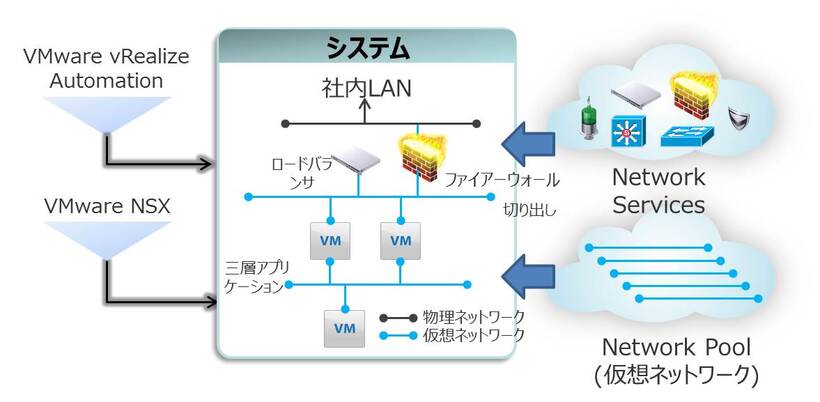 VMware NSXは、ネットワークサービスを抽象化し物理ハードウェアとリソースを分離するネットワーク仮想化プラットフォームのソフトウェアであり、vRAはNSXと連携することで柔軟なネットワーク環境を利用者自身で作成し管理できるようになります。