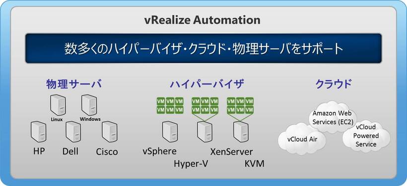 vRAは、vSphereだけでなく多くのハイパーバイザおよびパブリッククラウド、物理サーバへの展開をサポートしています。