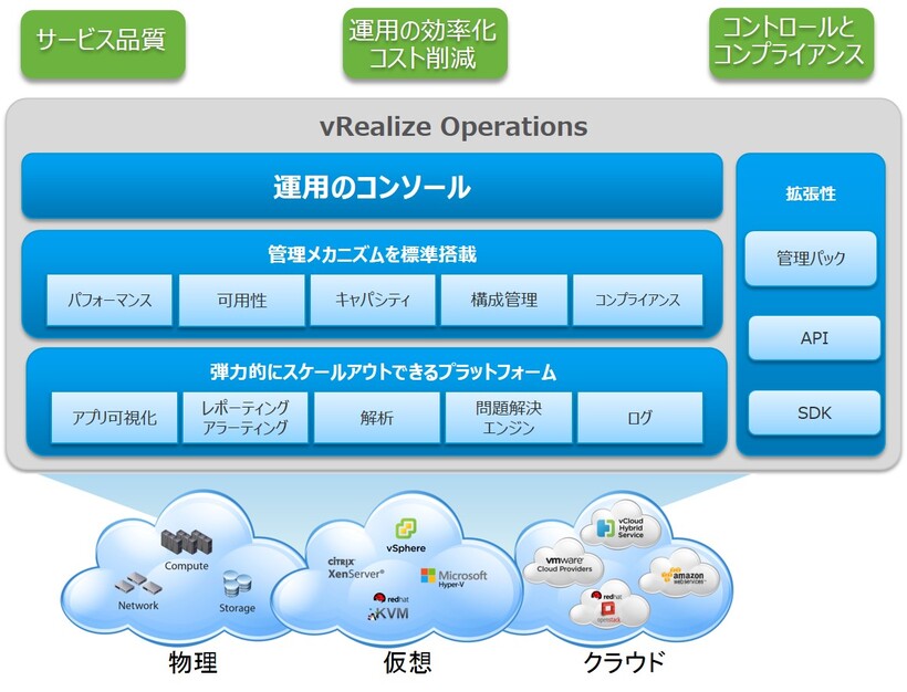 VMware vRealize™ Operations™(以下 vROps)はvCenter Serverで管理されている仮想化環境を最適に利用するためのアドバイスを提示する製品です。仮想化環境では、ハイパーバイザーのレイヤーが追加されるため性能や障害問題があったときに仮想マシン、ESXi ホスト、ストレージなど問題個所を切り分けるのにはVMwareの製品知識が十分にないと、困難な場合があります。vRealize Operationsを利用するとvCenter Serverから様々なメトリック情報を取得・分析して根本原因に対するアドバイスを提供します。