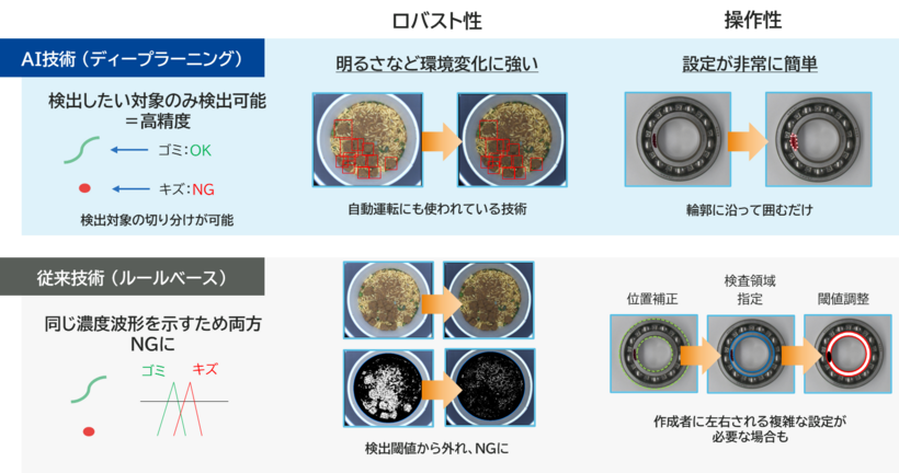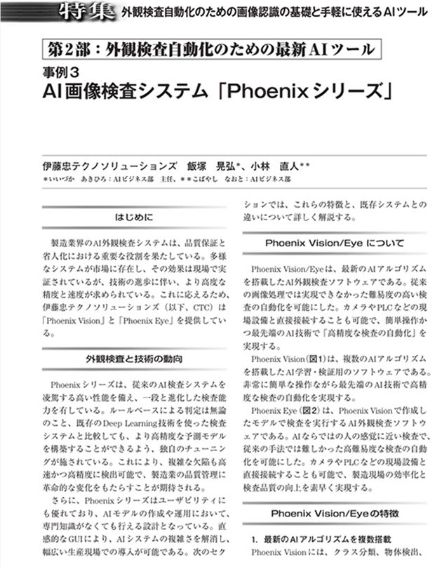 2024年03月11日更新 独自のAI技術を活用したアプリケーション"Phoenixシリーズ"で従来の手法では難しい外観検査や異音・振動検査の自動化を実現 DX AI IoT イノベーション 業務効率化 品質向上 製造 概要 AI外観検査 AI異音・振動検査 「簡単操作」で誰でも直感的に操作が可能! 最先端のAI技術で高精度検査が実現 Phoenixシリーズとは Phoenixシリーズは、VRAIN Solution社が開発したアプライアンスサーバー製品です。AI外観検査システムやAI異音・振動検査システムを提供し、幅広いお客様の課題を解決いたします。 AI検査の強み AI(ディープラーニング)は「人の感性による判断」や「熟練検査員が検出する微細な欠陥」もモデル学習することで、同一検査基準で高精度検査を実現します。 熟練検査員の基準で検査自動化を実現 従来の検査システムでは、オペレータが属人的にしきい値を設定していたため、検査ラインや担当オペレーターによって検査基準が変わる問題が蔓延していました。一方、AI検査では検出対象の特徴を認識して安定的な検査が可能であるため、頻繁にしきい値を調整する必要がなく「検査基準の標準化」、「調整工数削減」が期待できます。 メディア 【寄稿】 日刊工業新聞社 機械設計(2024年3月号) AI画像検査システム 「Phoenixシリーズ」(PDF/1.5MB) 開発会社 株式会社 VRAIN Solution