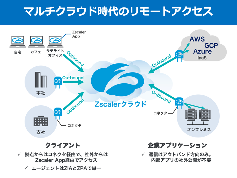 また、ZPAの提供コンポーネントは内部からZscalerクラウドへのアウトバウンドでのみ通信されるため、社内アプリケーションを外部に公開する必要がなく、かつ利用者は社内・社外を意識せずシームレスにアプリケーションを利用することができます。