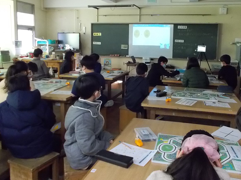 子どもたちは3人1組でITエンジニアになり、運送会社からの相談を受けます。物事を論理的に考える「プログラミング的思考」を学びながら、センサーロボットとオリジナルの地図を使い効率的な配達ルートを導き出しました。グループで話し合い、直線的なルートの方が効率的に配達できると仮説をたて、同じ道を通らないルートを考えるなど工夫をして、検証しました。